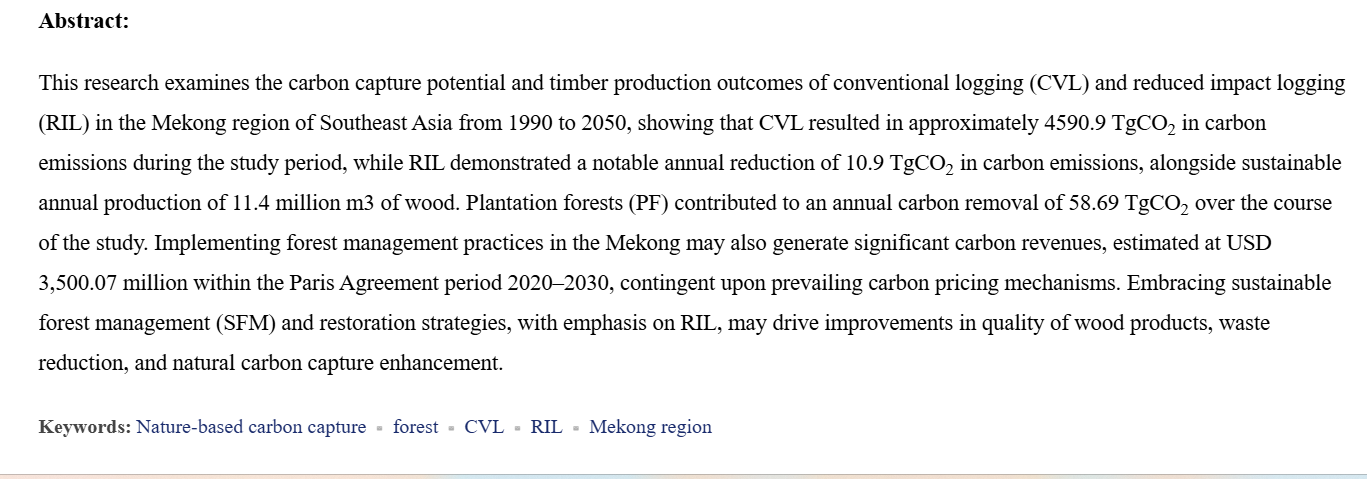 This research examines the carbon capture potential and timber production outcomes of conventional logging (CVL) and reduced impact logging (RIL) in the Mekong region of Southeast Asia from 1990 to 2050, showing that CVL resulted in approximately 4590.9 TgCO2 in carbon emissions during the study period, while RIL demonstrated a notable annual reduction of 10.9 TgCO2 in carbon emissions, alongside sustainable annual production of 11.4 million m3 of wood. Plantation forests (PF) contributed to an annual carbon removal of 58.69 TgCO2 over the course of the study. Implementing forest management practices in the Mekong may also generate significant carbon revenues, estimated at USD 3,500.07 million within the Paris Agreement period 2020–2030, contingent upon prevailing carbon pricing mechanisms. Embracing sustainable forest management (SFM) and restoration strategies, with emphasis on RIL, may drive improvements in quality of wood products, waste reduction, and natural carbon capture enhancement.
